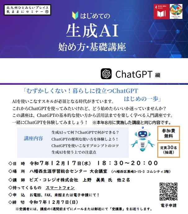 北九州市のどこかで実施していないか検索してみたところ、八幡西生涯学習センターが主催している「はじめての生成AI始め方・基礎講座」というセミナーを発見。