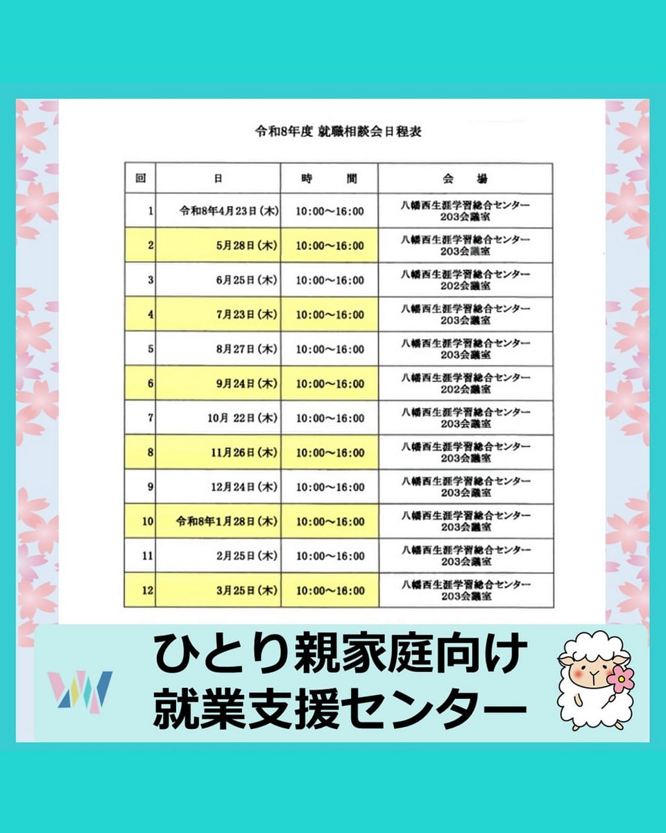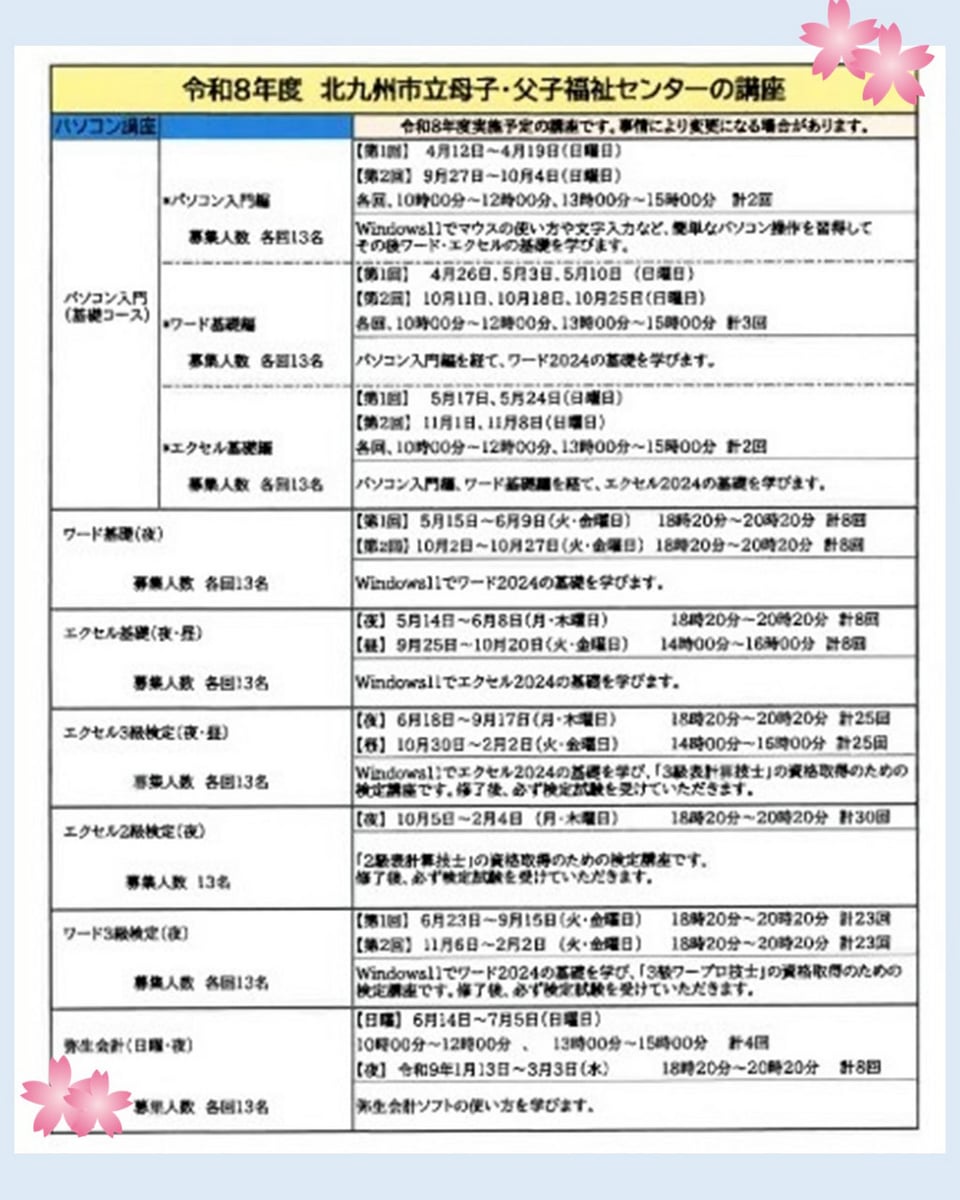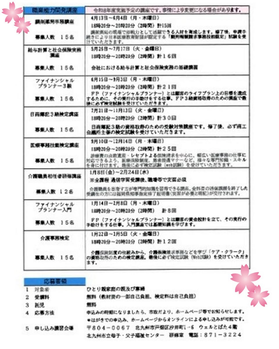 令和8年度北九州市立母子・父子福祉センターの「就業支援講座」 「出張就職相談会」の日程が決まりました❣