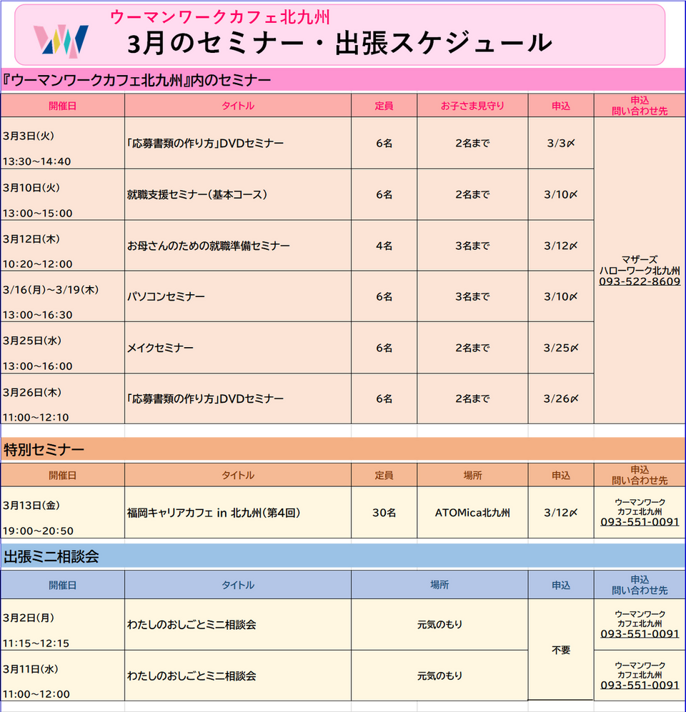 ウーマンワークカフェ北九州3月イベントカレンダーアップしました(北九州市)