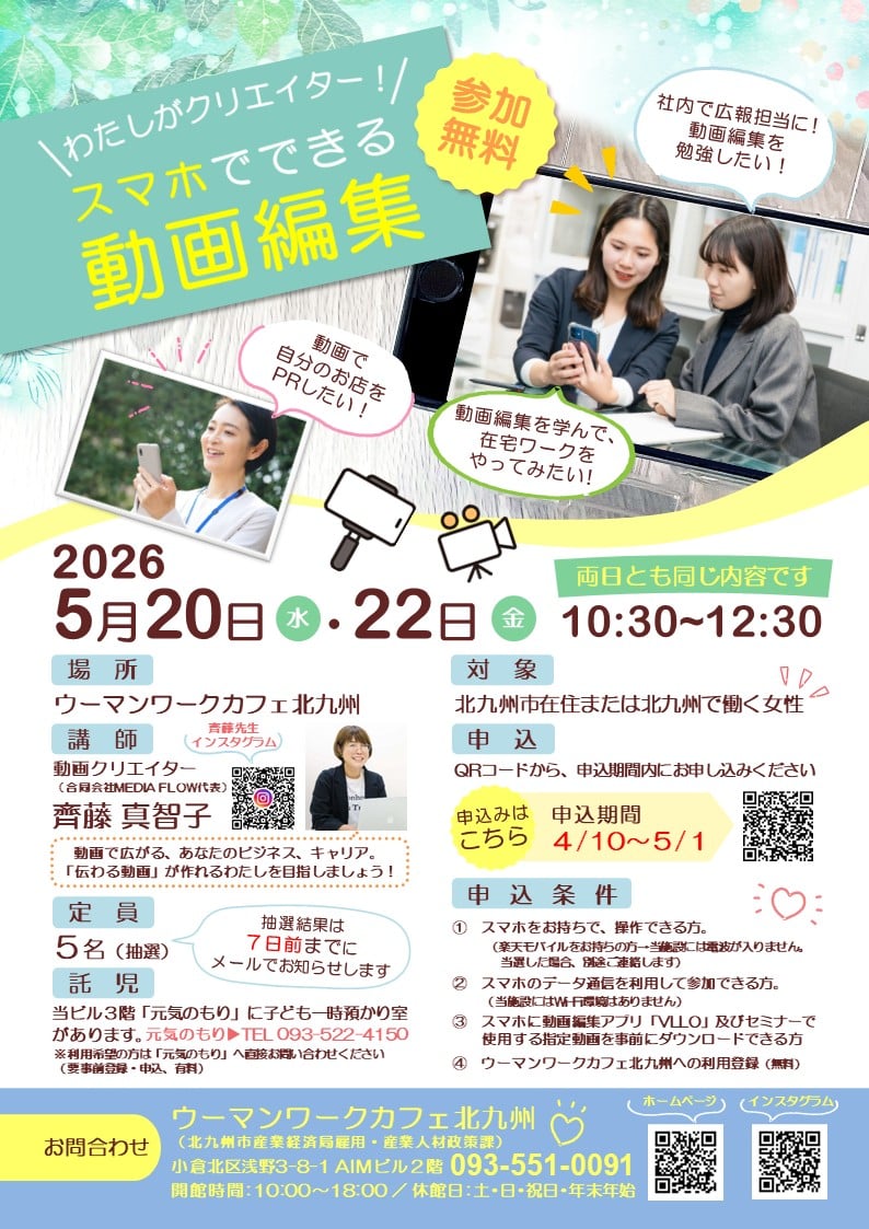 🔷日時 2026年5月20日(水)10:30~12:30 2026年5月22日(金)10:30~12:30 ※両日とも同じ内容です 🔷場所 ウーマンワークカフェ北九州 🔷講師 動画クリエイター(合同会社MEDIA FLOW代表)齊藤 真智子 🔷定員 5名 (抽選) 🔷対象 北九州市在住または北九州市で働く女性、仕事(起業や在宅ワークも含む)で動画編集を活用したい女性 🔷参加 無料 ♦申込♦ https://ttzk.graffer.jp/city-kitakyushu/smart-apply/apply-procedure-alias/douga/door から、下記申込期間内にお申込みください。 【申込期間】 💚4月10日~5月1日 ※抽選結果は、開催日の7日前までにメールでお知らせします ※申込時に登録したメールアドレスに送ります