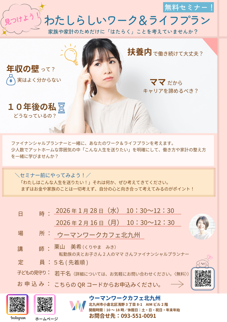 ファイナンシャルプランナーと一緒に、あなたのワーク&ライフプランを考えます。 ♦日 程:1月28日(水)・2月16日(月) ♦場 所:ウーマンワークカフェ北九州 ♦料 金:無料 |