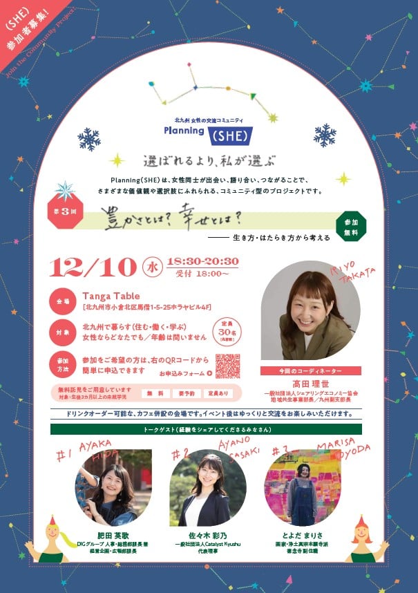 🌟第3回テーマ🌟 「豊かさとは?幸せとは?」 ♦コーディネーター 💛髙田 理世 ♦トークゲスト 💛佐々木 彩乃 💛とよだ まりさ ♦日時 ♦ 会場 ♦ 参加料 ♦ 対象 🌟無料託児あり(要予約/定員あり) 🌱新しいつながりや気づきがきっと見つかる時間です。 次回の日程や、詳細はHPにて順次公開されます |
